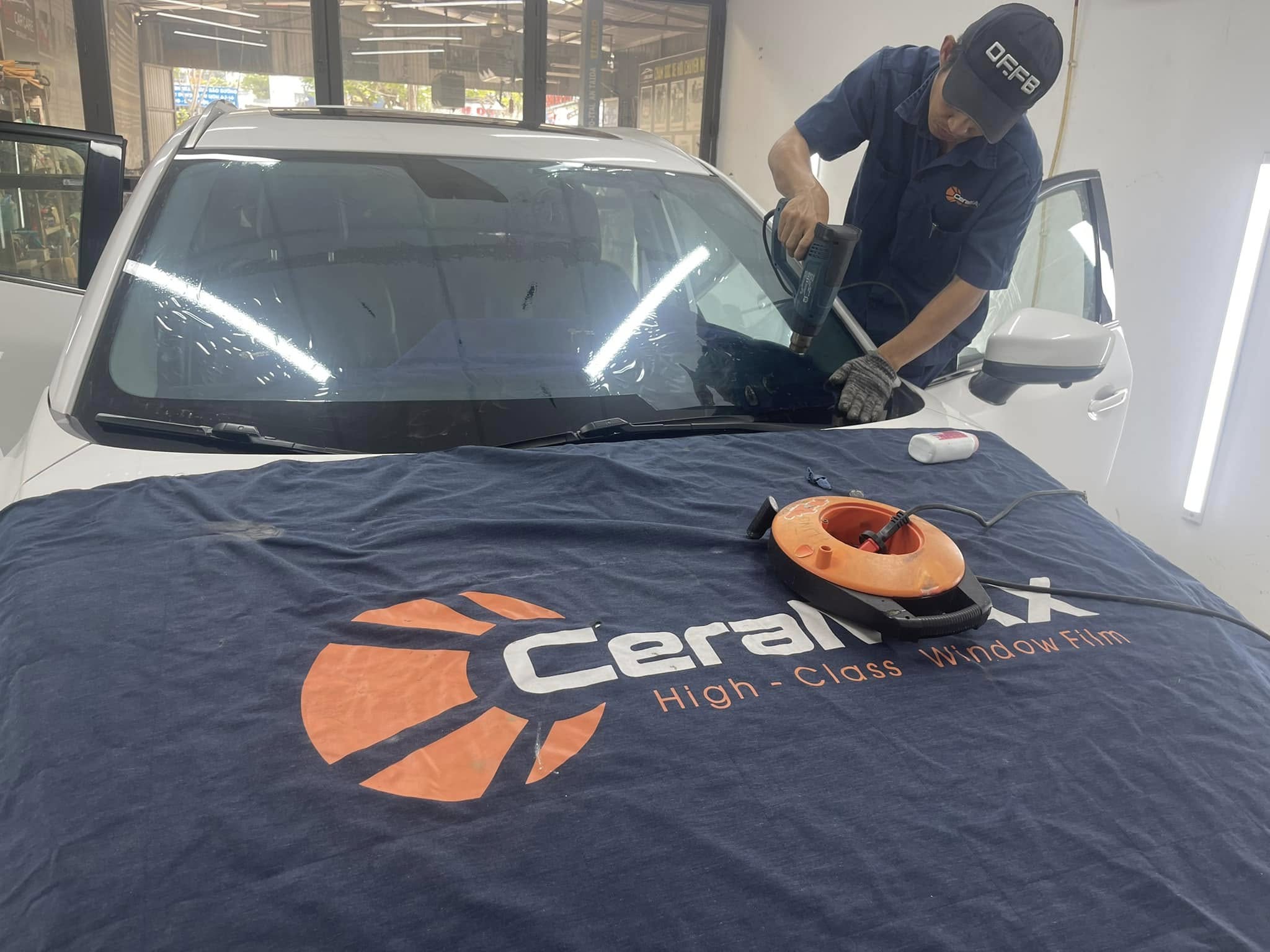 1. **Lột phim cũ** cẩn thận bằng dung dịch chuyên dụng, không làm trầy kính. 2. **Làm sạch hoàn toàn bề mặt kính**, loại bỏ keo cũ, bụi bẩn. 3. **Tư vấn chọn mã phim Ceramax phù hợp**, cân bằng giữa thẩm mỹ và hiệu suất cản nhiệt. 4. **Thi công trong phòng kín**, đảm bảo không bọt khí, không bụi. 5. **Kiểm tra và bàn giao xe**, hướng dẫn cách bảo dưỡng sau dán.